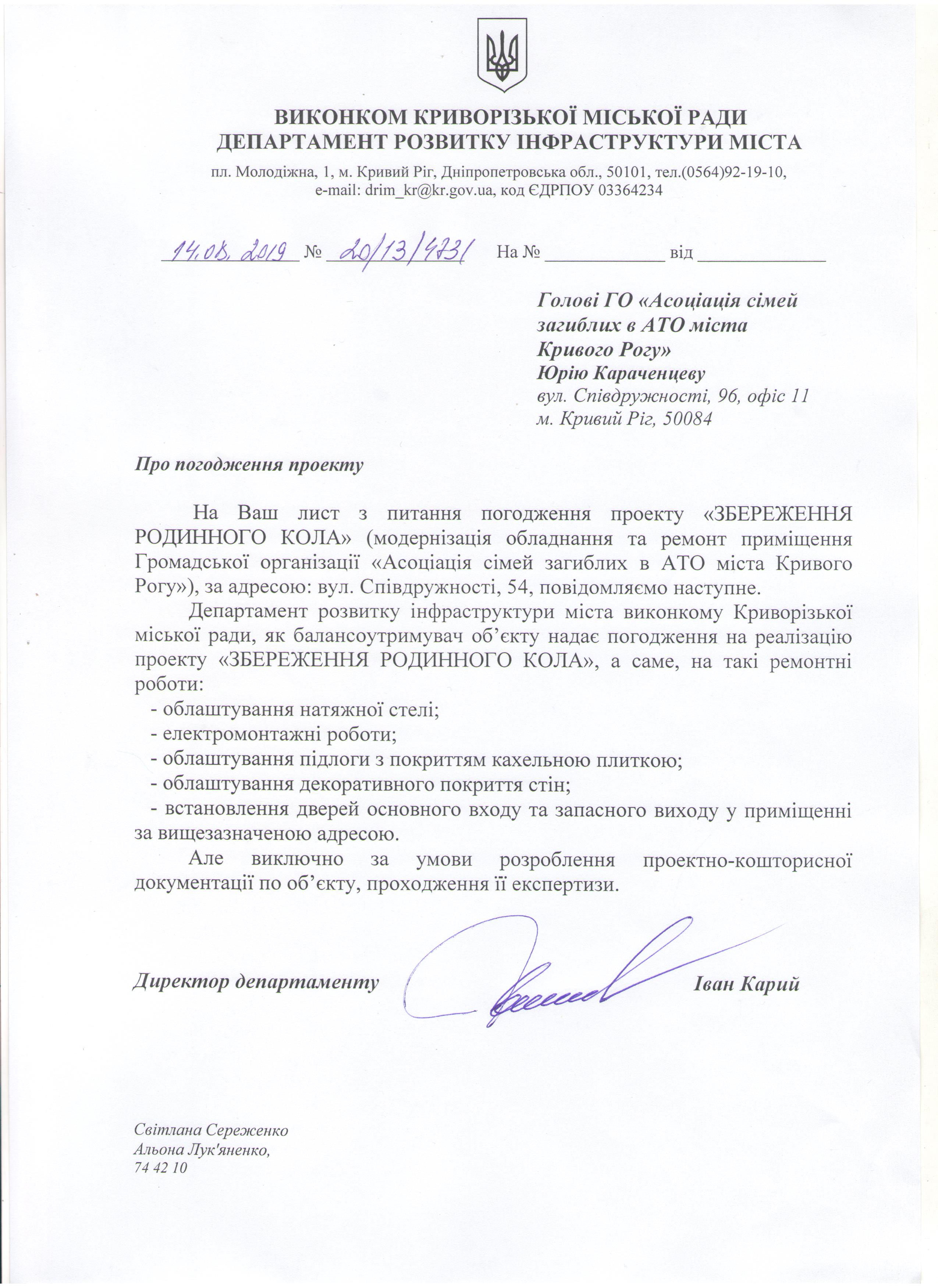 Короткотривалі результати: Реалізація проекту дозволить одержати як короткотривалі, так і перспективні результати. Короткотривалі результати проекту полягають в модернізації та осучаснені офісу, а саме: косметичний ремонт; необхідні меблі: стільці в кількості 50 шт. столи офісні в кількості 3 шт.); проектор мультимедійний, SMART-телевізор, ноутбук, кондиціонери 2 шт.), що відповідатиме комфортним, належним для організації роботи Громадської організації «Асоціація сімей загиблих в АТО міста Кривого Рогу».